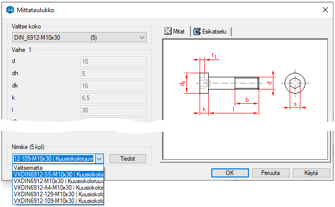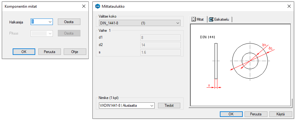 Valitse dialogista Komponentin mitat Halkaisija: 8 ja paina OK.