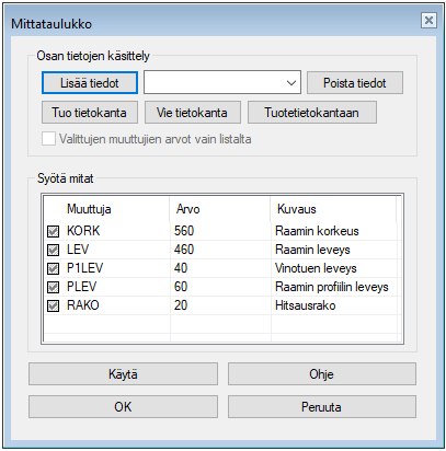 Suosittelemme, että käytät mittamuuttujien nimissä vain isoja kirjaimia.