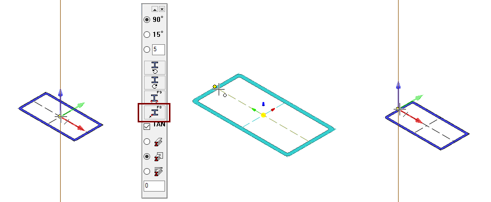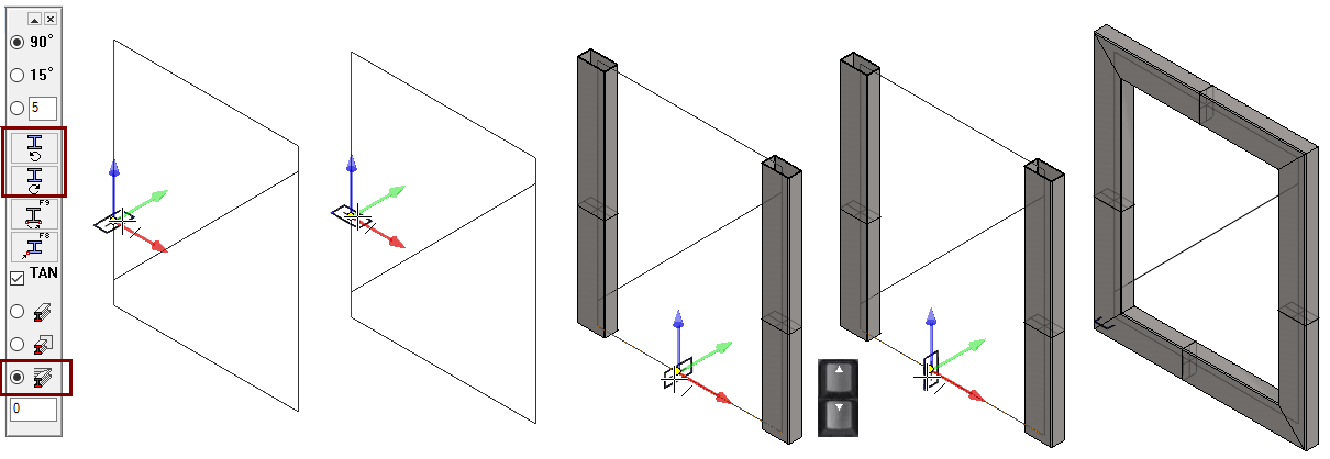 Vie profiilin poikkileikkaus ohjausviivan päälle. Jos se on väärässä suunnassa (vasen kuva), käännä profiili työpöydän vasemmassa yläkulmassa olevan valikon kääntö-painikkeilla (joko vasta- tai myötäpäivään).