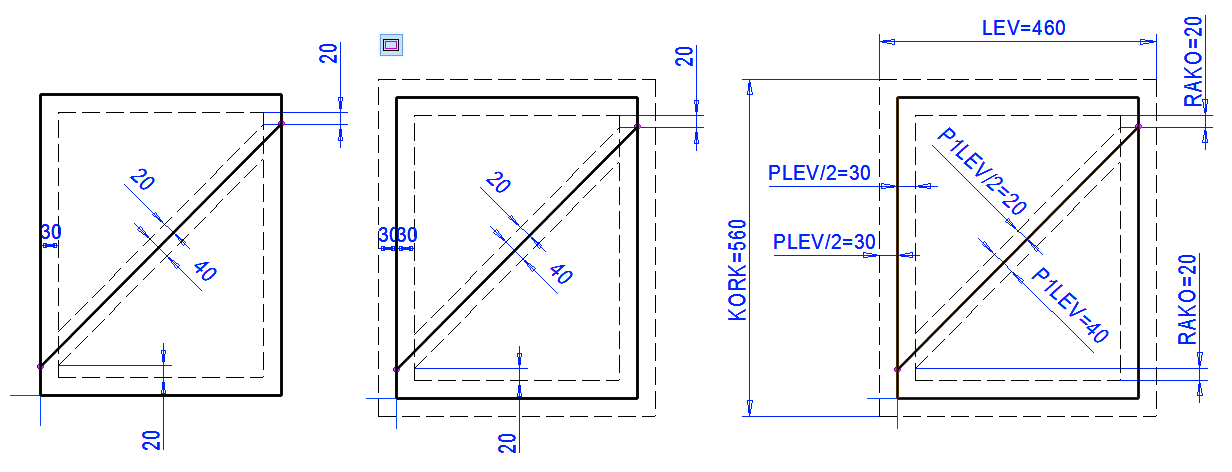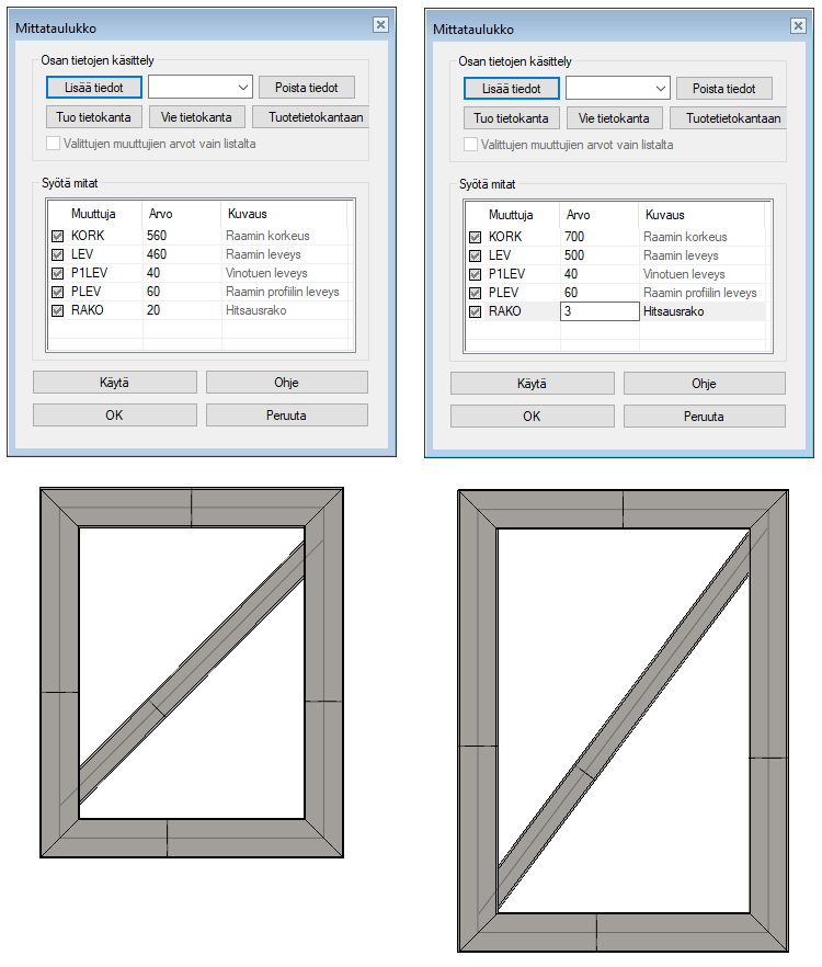 Lisää päämitat ja anna niiden kaavakenttiin arvot KORK ja LEV (oikeanpuoleisin kuva).