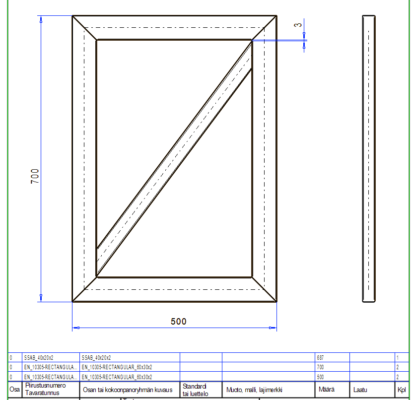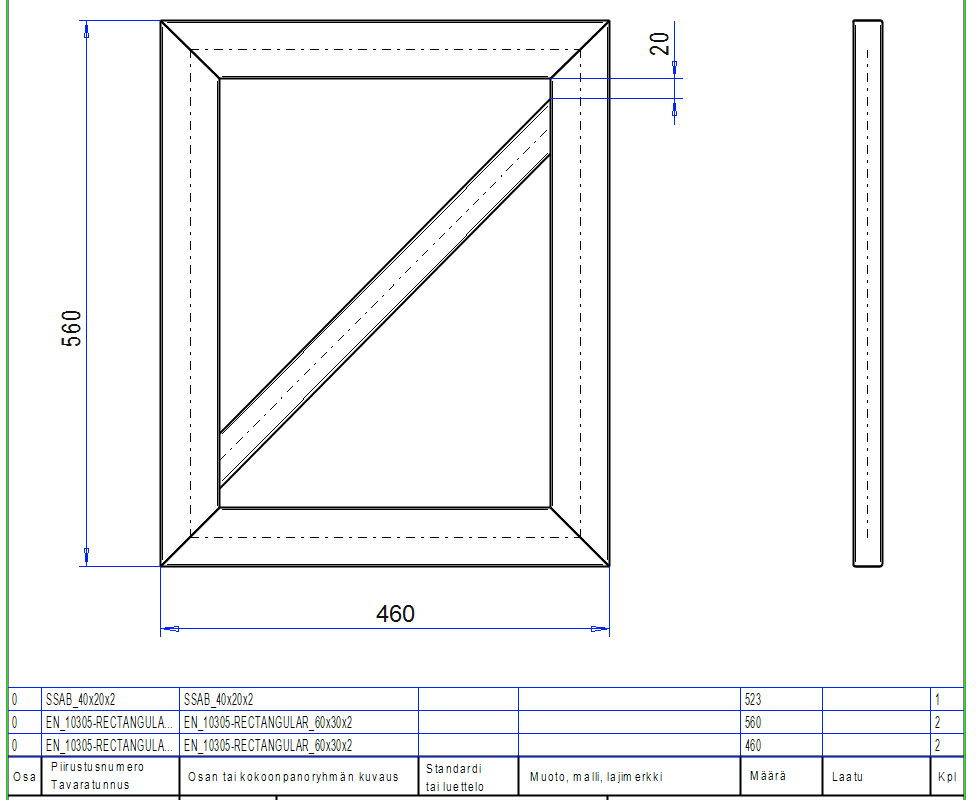 Huomaathan että teimme luonnoksen mitoille 500 * 400, mutta että mallissa kehyksen mitaksi tulee 560 * 460.