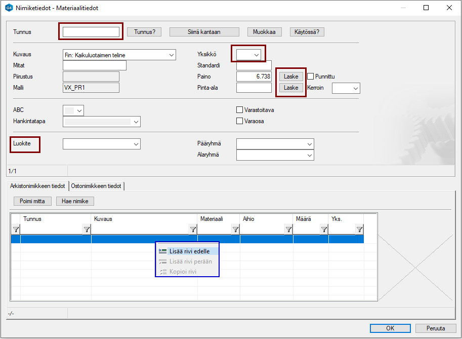 Materiaali-tietokantaa (d_SPEC1) voit täydentää toiminnolla Järjestelmä > Materiaalit (tai Järjestelmä > Sovellus > Materiaali.)