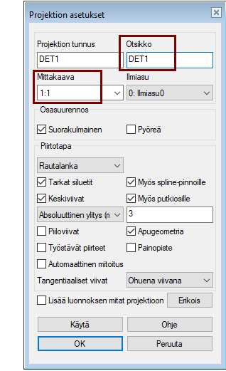 Mittakaava: Valitse koneenpiirustusstandardin mukainen mittakaava (Myös villejä mittakaavoja voit tarvittaessa syöttää, mutta niitä käytetään yleensä vain isometrisissä tai perspektiivisissä projektioissa.)