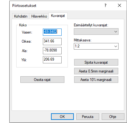 Jos projektiot eivät mahdu piirustuslomakkeelle, on mahdollista joko vaihtaa lomake isompaan tai sitten muuttaa piirustuksen mittakaavaa.