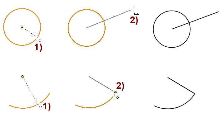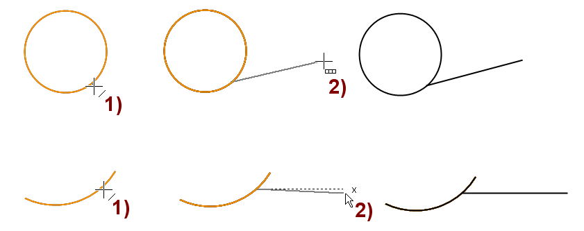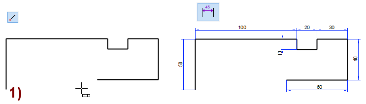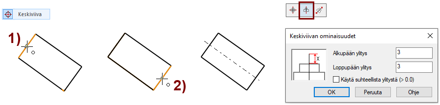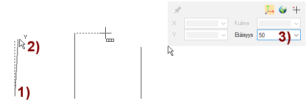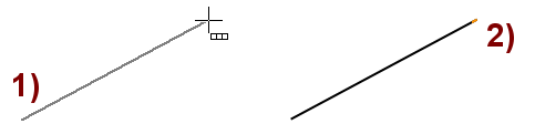 Siirrä kohdistinta vinosti ylös (tai alas), kunnes näet kohdistimen vieressä 45°-symbolin ja samansuuntaisen katkoviivan. Napsauta tällöin kohdistinta 2).