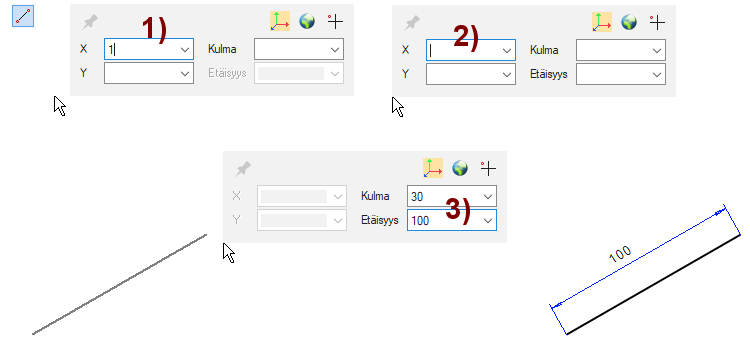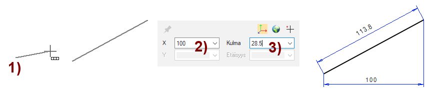 Syötä numeronäppäimistöltä viivan vaakasuuntainen pituus, esim. 100 ja kulma, esim. 28.5