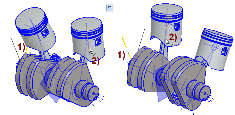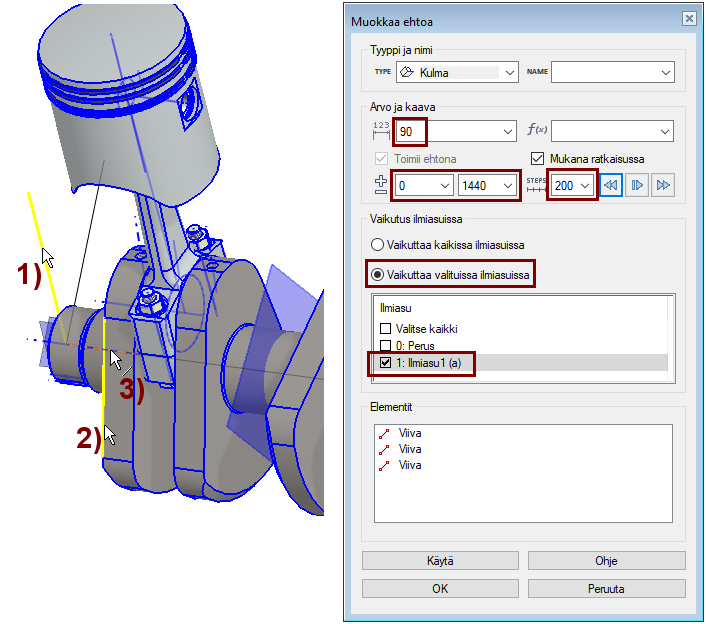 Harjoituksessa lisätään valmiiksi mallinnettuja osia kokoonpanoihin sekä tehdään näistä kokoonpanoista uusia kokoonpanoja. Poistetaan alikokoonpanona toimivan männän ja kiertokangen ehtojen jäädytys, eli sallitaan että alikoonnan ehdot ratkeavat myös pääkoonnassa, jolloin männät liikkuvat aina sylinterin suunnassa riippumatta kiertokangen asennosta. Lopuksi lisätään kulmaehto ja simuloidaan osien liikkumista.