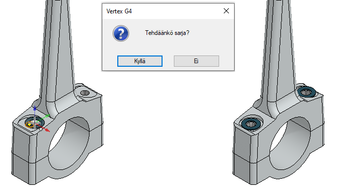 Kun kokoonpanossa ollaan lisäämässä osaan siten että osoitetusta kohdasta löytyy osamallissa sarjassa olevaa geometriaa, niin ohjelma mahdollistaa, että osa lisätään sarjaan tuon piirresarjan perusteella.