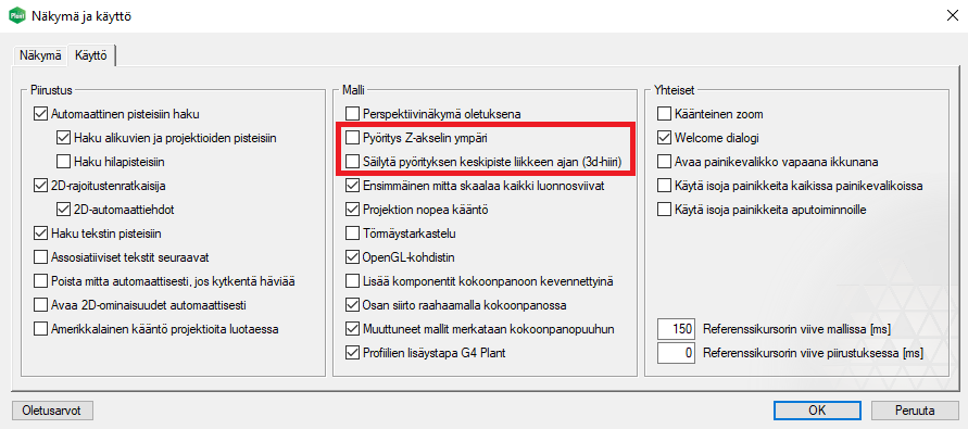 Kun asetus ei ole käytössä (oletus), ja pyörität mallia 3d-hiirellä, pyörityksen keskipiste päivittyy liikkeen aikana.