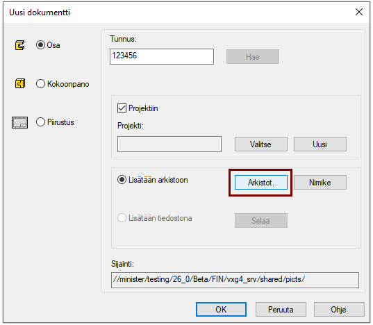 Projektin voit luoda uutta dokumenttia luotaessa tai myös erikseen Arkisto-välilehden Projektit-ryhmän toiminnolla Uusi.