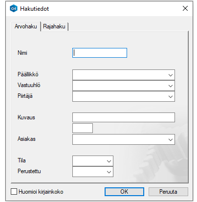 Päällikkö- Vastuuhlö- ja Piirtäjä-kenttiin voit hakea esivalintapainikkeella henkilön nimen.