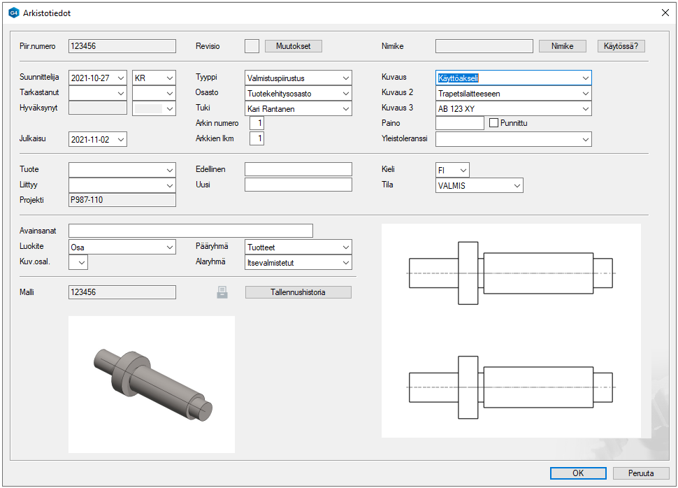 Täytä malliarkistokortti mahdollisimman hyvin, sillä ne periytyvät myös piirustukselle (jonka tietoja voit toki muokata yksilöllisesti) ja josta ne siirtyvät piirustuslomakkeen otsikkotauluun automaattisesti.