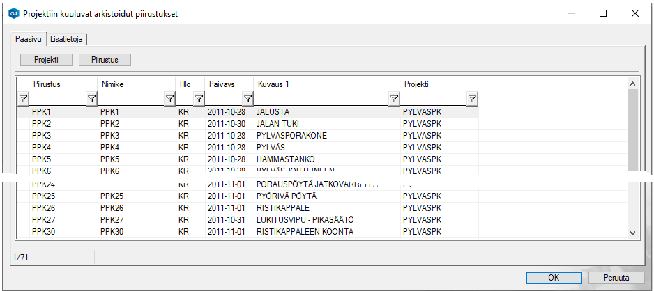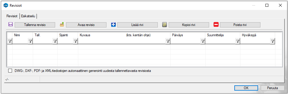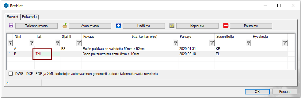 Painikkeen Avaa revisio avulla voit avata ao. piirustustiedoston (Huomaa, että vain sellaiselta riviltä avaus onnistuu, jossa Tall.- (tallennus-) sarakkeessa on merkintä Tall.