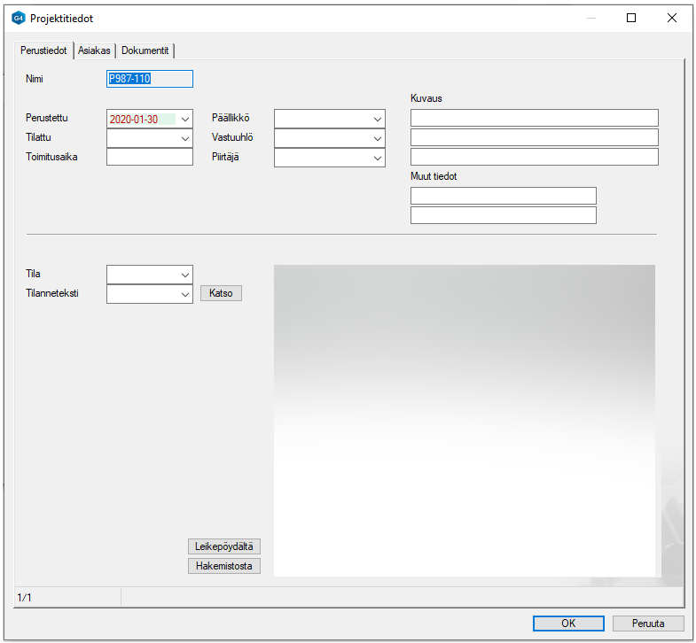-kenttiin ja Muut tiedot-kenttiin voit kirjoittaa projektia kuvaavat tekstit.Tila-kentän avulla voit ylläpitää projektin tilaa, esim. UUSI, KESKEN, VALMIS jne..