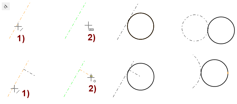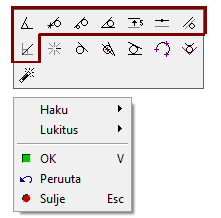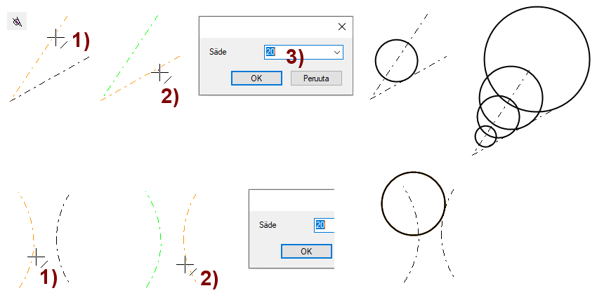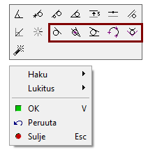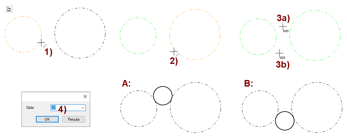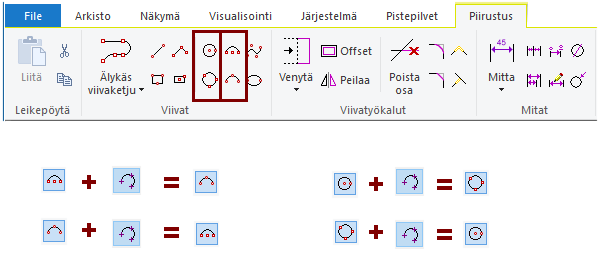 Pieni merkitys tällä aputoiminnolla on silloin, jos haluat piirtää kerralla useita kaaria/ympyröitä, joista osa on keskipiste-kaaria/ympyröitä ja osa on kolmen pisteen kaaria/ympyröitä. Tällöin ei tarvitse vaihtaa toimintoa valintanauhasta, vaan voit vaihtaa toiminnon apuvalikon kautta.