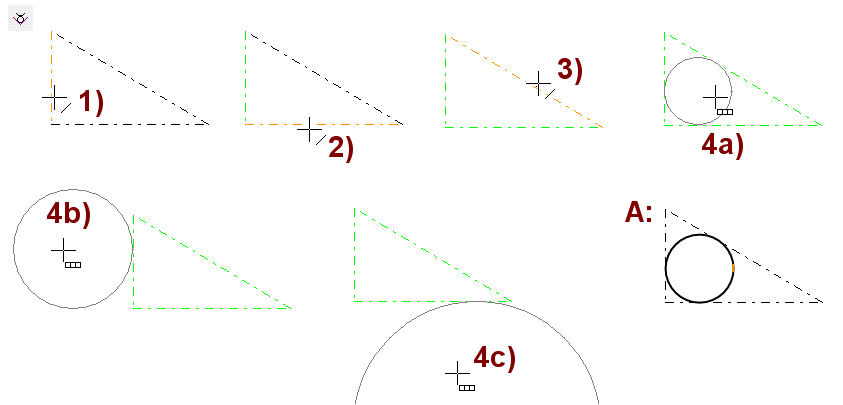 Ohjelma ehdottaa ympyrälle paikkaa, riippuen siitä missä kohdistimesi on. Kuvat 4a), 4b) ja 4c).