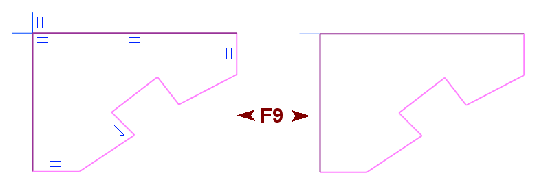 Ohjelma lisää viivoja piirrettäessä ehtoja: mm. viivan päiden välille yhtenevyyksiä, yhdensuuntaisuuksia (origon viivojen kanssa) ja suuntia. Jokaista tällaista ehtoa vastaa sininen symboli luonnoksessa.