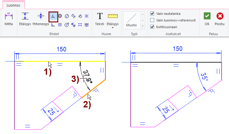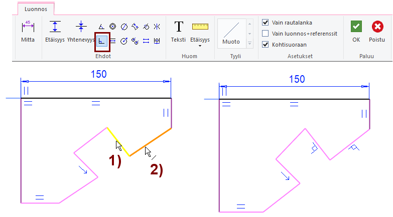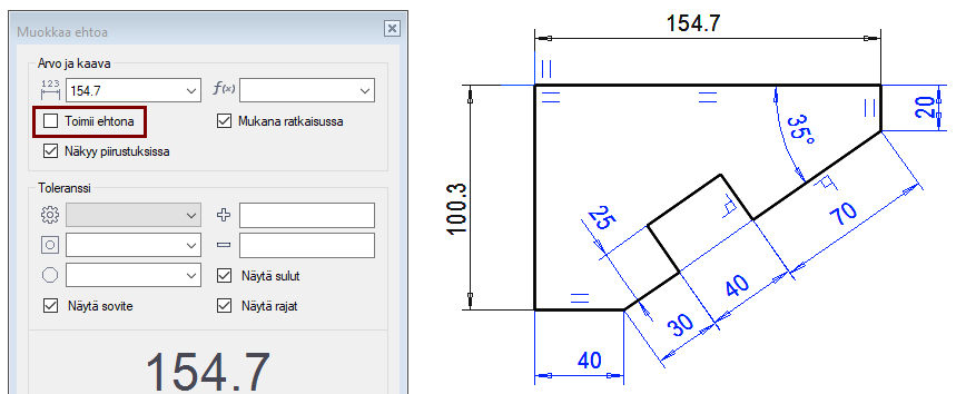 Voit lisätä luonnokseen Mitta-, Etäisyys- tai Kulmaehtoja ja ottaa niiltä pois ominaisuuden Toimii ehtona.