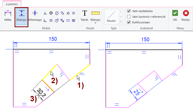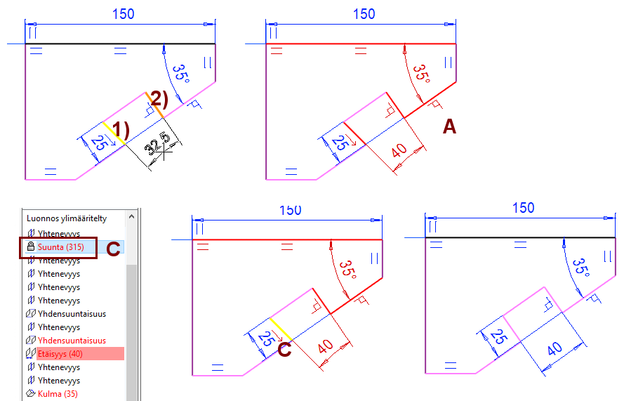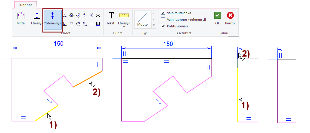 Kuvan viivalla 1) on olemassa suuntaehto (Viivan vieressä on nuoli ja piirrepuun alta löytyy ehto Suunta (315).