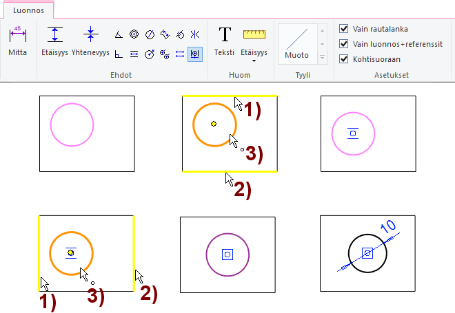 Luonnostyökaluista yhtenevyyden, kohtisuoruuden, kulman ja keskipisteen.