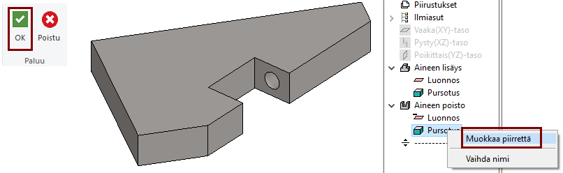 Tarkoitus on pursottaa reikä koko kappaleen läpi, joten vie kohdistin piirrepuussa kohdan Pursotus päälle ja valitse tilannekohtainen toiminto: Muokkaa piirrettä.