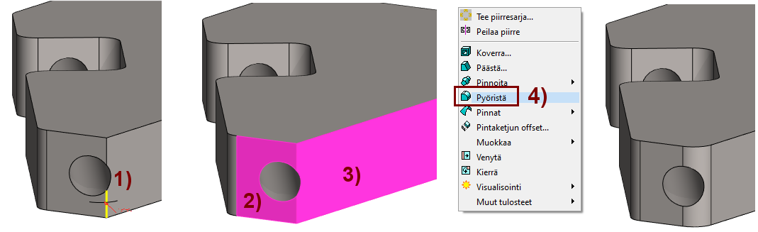 Jos valitset kuvassa 1) näkyvän viivan, niin se (todennäköisesti) estää pyöristyksen syntymisen. (Riippuu pyöristyssäteen arvosta).