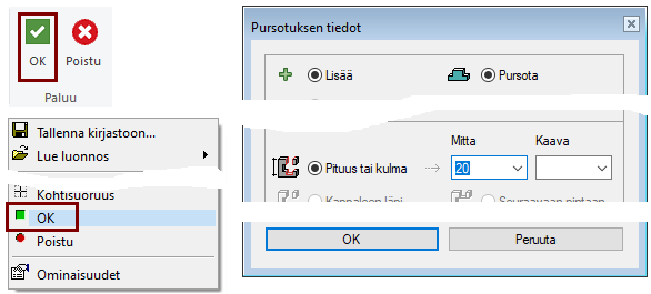Ohjelma hyppää valikkoon Pursotuksen tiedot.