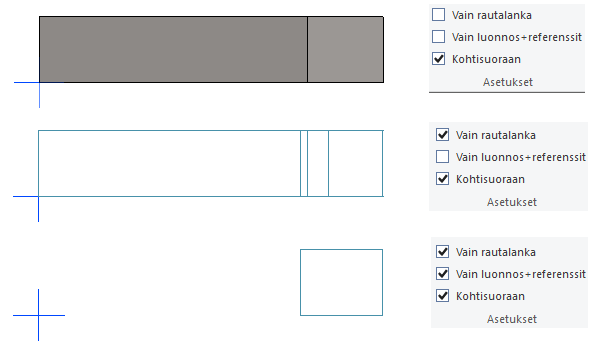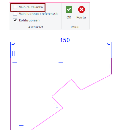 Kohtisuoraan-asetuksen olellessa valittuna, luonnostelu käännetään aina kohtisuoraan, kun osamallinnuksesta tullaan luonnostelutilaan.