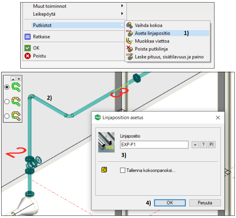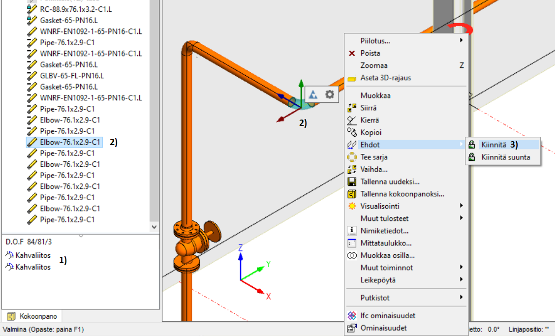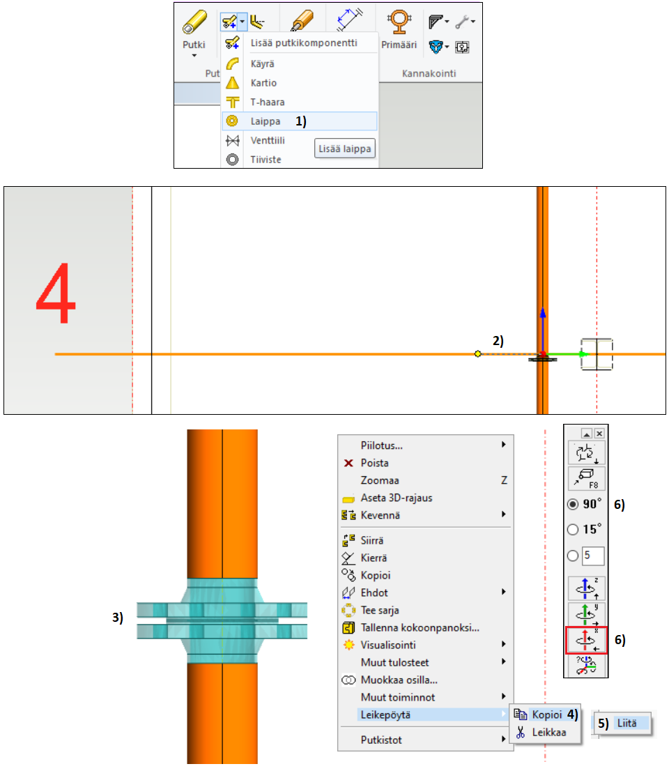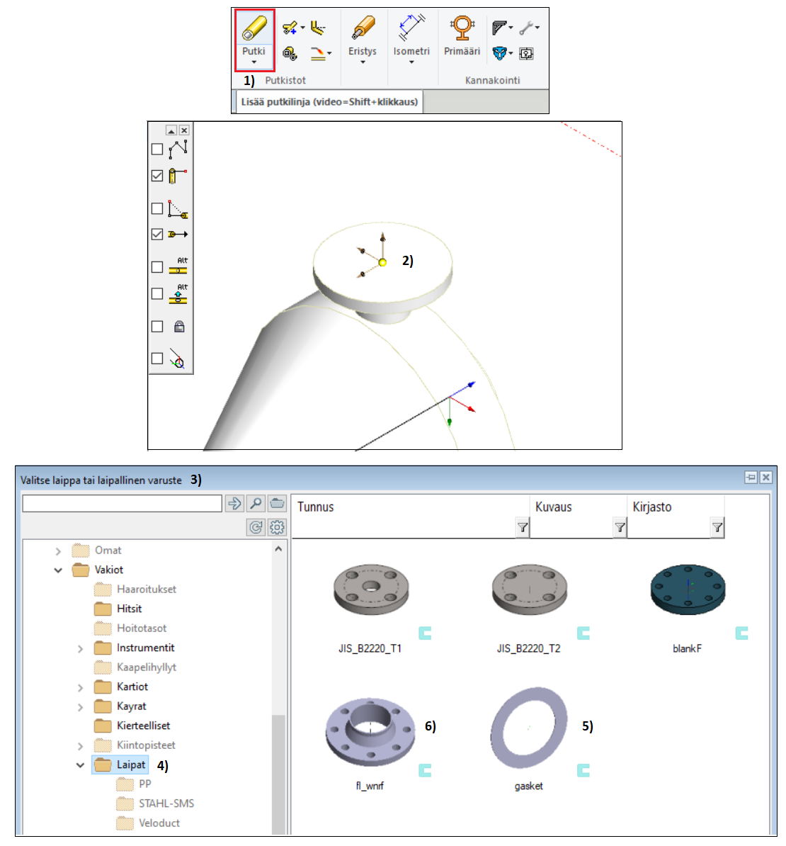 Ohjelma lisää laipan tiivisteeseen >Hyväksy putkikomponentin paikka ja asento > Tilannekohtainen toiminto: OK.