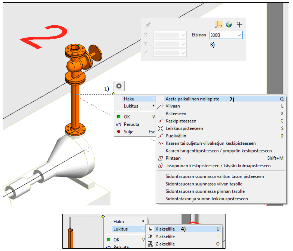 Ohjelma lisää tiivisteen pumpun laippaan >Hyväksy putkikomponentin paikka ja asento > Tilannekohtainen toiminto: OK.