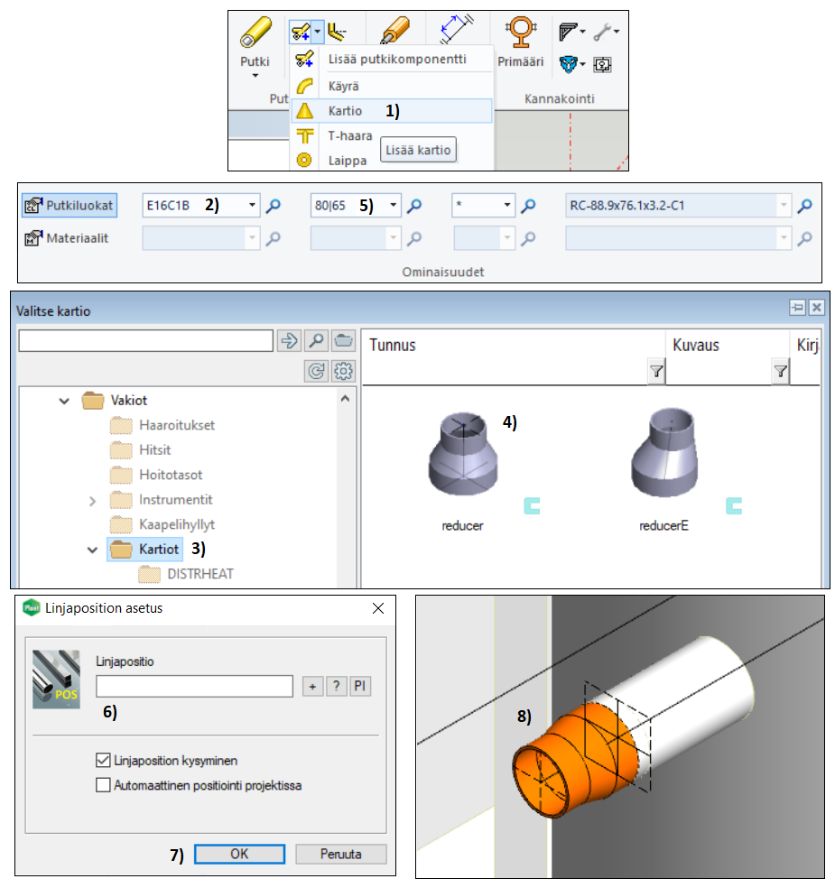 Toiminto Lisää putkikomponentti > Lisää kartio, kuvassa 1).