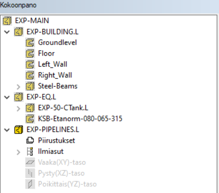 Olet nyt muokkaamassa putkistot-mallin sisältöä. Muiden kokoonpanojen kuvakkeet näkyvät kokoonpanopuuussa epäterävinä ja muokattavissa olevan kokoonpanon kuvake on terävä.