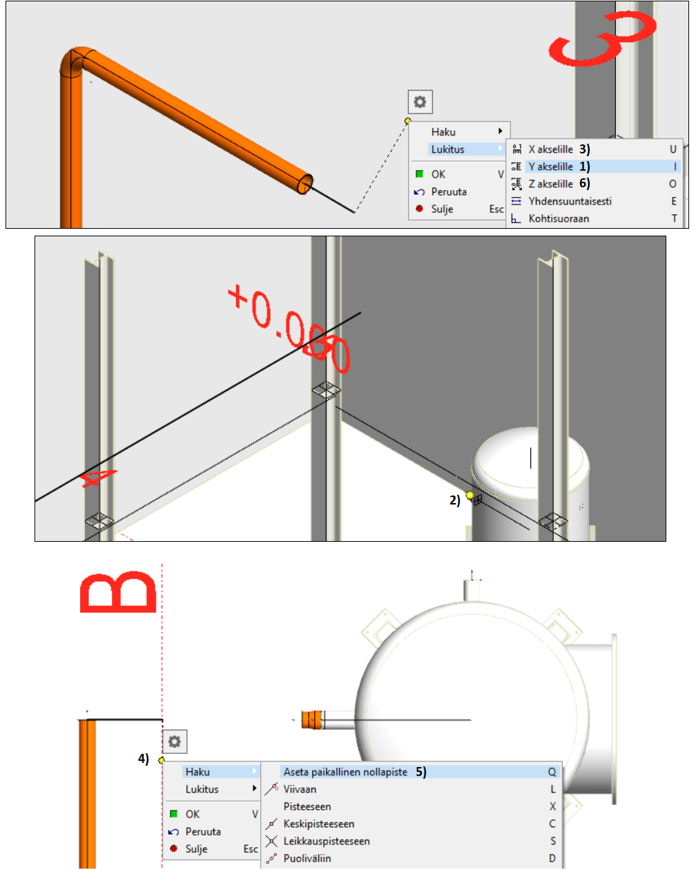 Varmista, että putken keskilinjan pää linjaviivan Boikealla puolella > Syötä etäisyys näppäimistöltä käyttäen numeronäppämiä > Etäisyys = 200 > Hyväksy mitta Enter-painikkeella näppäimistöltä.