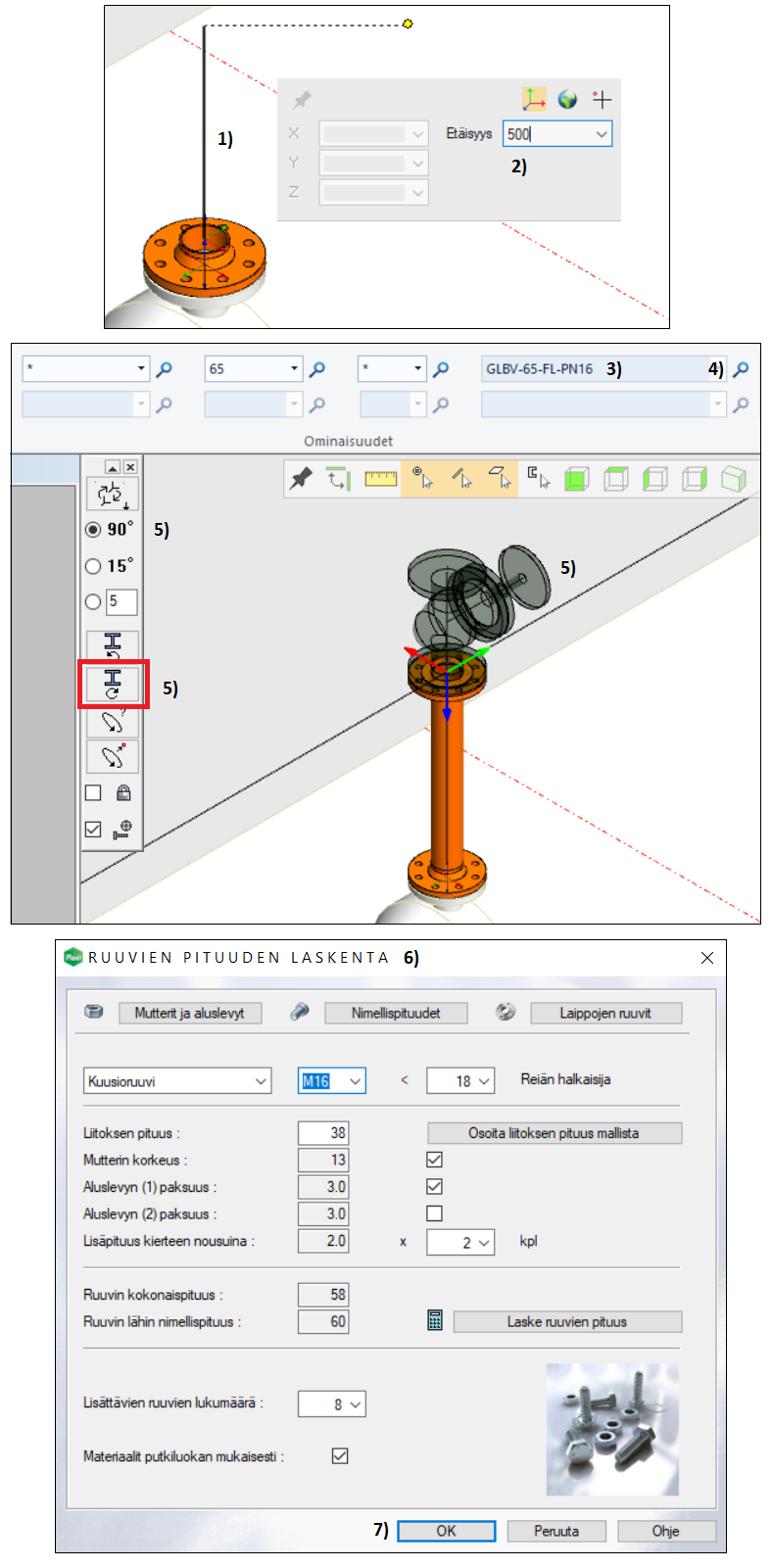 Ohjelma laskee automaattisesti näiden laippojen pulttipintojen välisen etäisyyden ja tarjoaa sopivia liitoskomponentteja, mikäli putkiluokalle on määritetty liitoskomponentit.