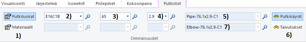 Ominaisuudet voi valita joko Putkiluokan (suositeltava) tai Materiaalin perusteella, kuvassa 1).