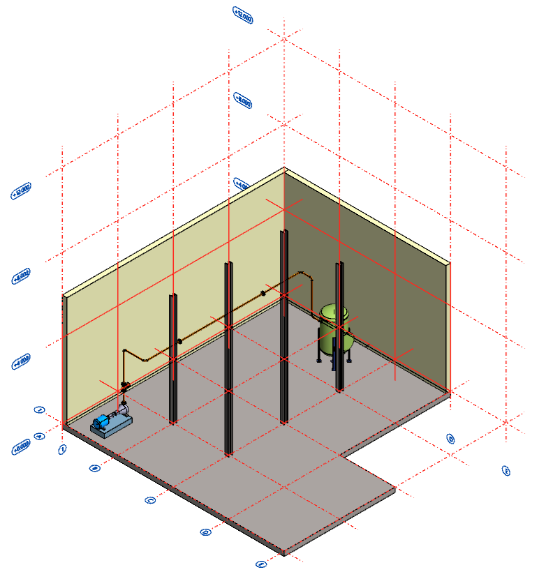 Reititetään putkilinja pumpun poistolaipasta (DN 65) säiliön yhteeseen (DN 80) ja lisätään tarvittavat putkikomponentit linjaan sekä reitityksen aikana että ennen ja jälkeen reitityksen.