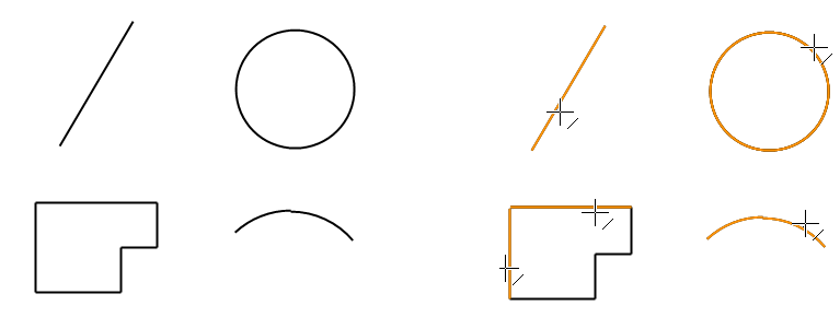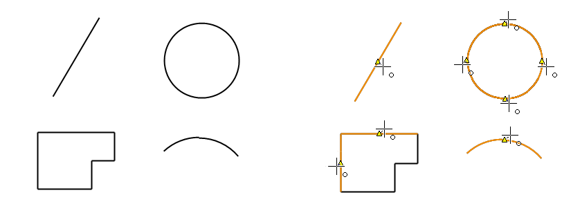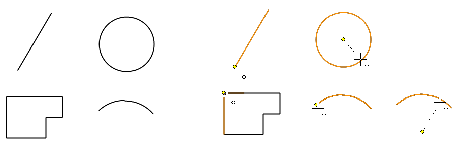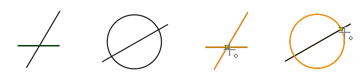 Piirrä viivoja jotka lähtevät liikkeelle viivan päätepisteistä tai ympyrän/kaaren keskipisteestä tai päätyvät niihin