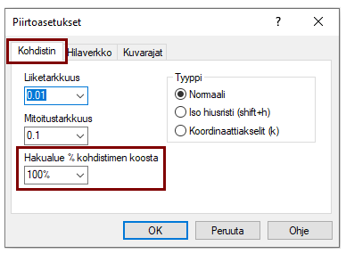 Automaattiset haut ovat voimassa, kun jokin viivan piirto-toiminto on käynnissä ja kohdistimesi ns. hakualue on viivan tai pisteen päällä.