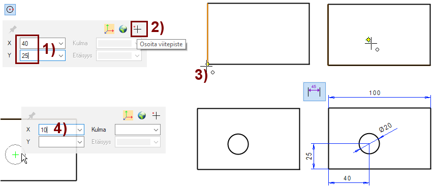 Ympyrän keskipiste kiinnittyy referenssipisteestä 40 mm oikealle ja 25 mm ylös.