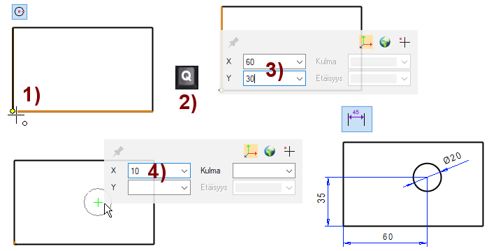 Ympyrän keskipiste kiinnittyy referenssipisteestä 60 mm oikealle ja 35 mm ylös.