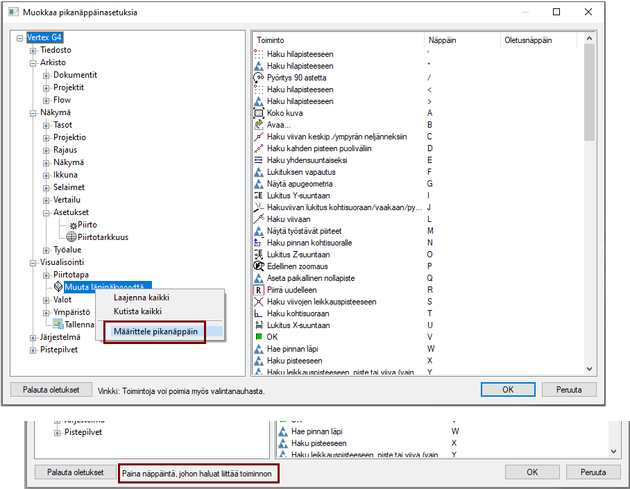Valikko Muokkaa pikanäppäinasetuksia esittelee käytössä olevia näppäimiä, mutta ei osaa kertoa vapaita näppäimiä.