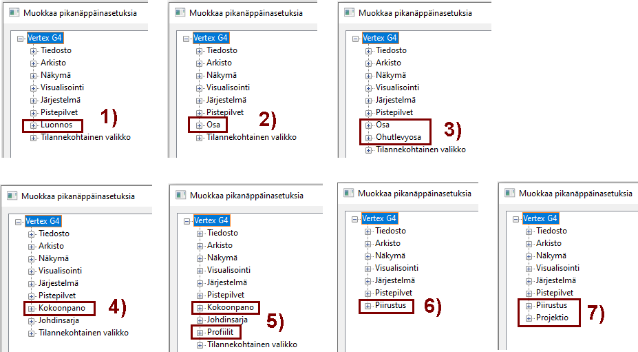 Oletuksena Vertex käyttää jo varsin paljon näppäimiä käynnistämään tai ohjamaan käynnissä olevia toimintoja, eli valtaosalla näppäimistön näppäimistä on jo jokin merkitys.
