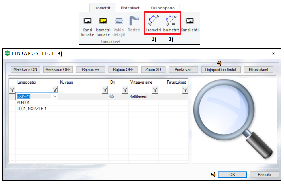 Isometripiitustuksen generoimisen voi käynnistää joko välilehdeltä Kokoonpanotai Isometrit.