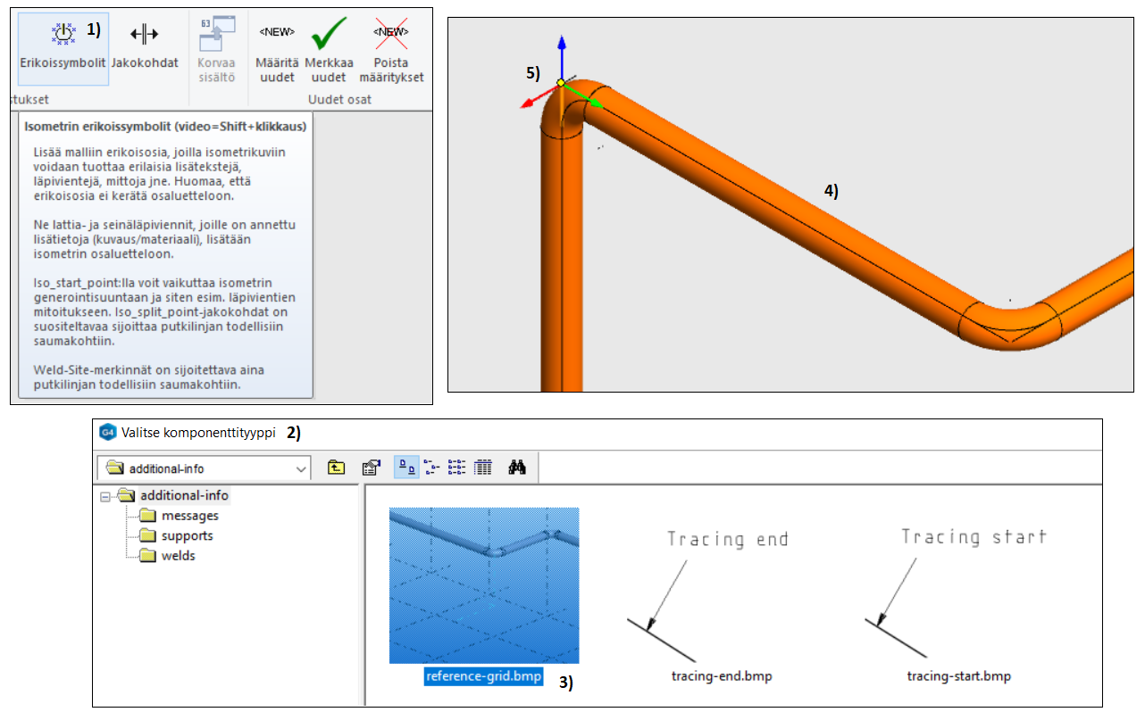 Viittaukset: Ohjelma tunnistaa, että putkilinja liittyy positioituun laitteeseen tai toiseen putkilinjaan ja lisää tunnisteen isometriin, kuvassa 1).