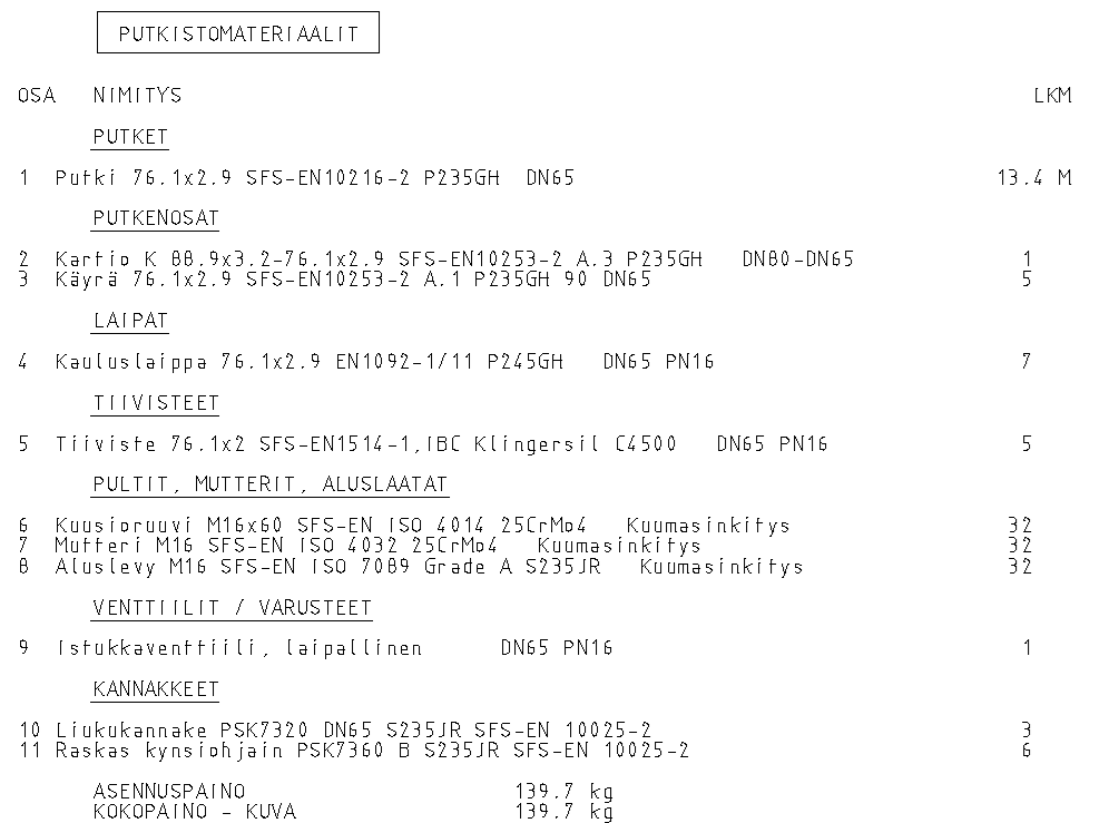Isometripiirustuksessa näkyy ohjelman oletusasetuksilla varsinainen isometri, osaluettelo, katkaisulista ja nimiö.
