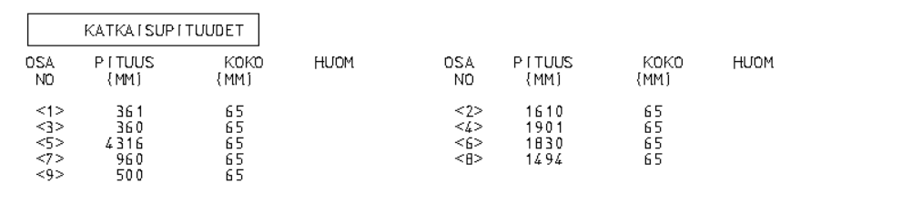 Katkaisulistassa näkyy putkiosuuksien katkaisunumero, katkaisupituus ja koko.