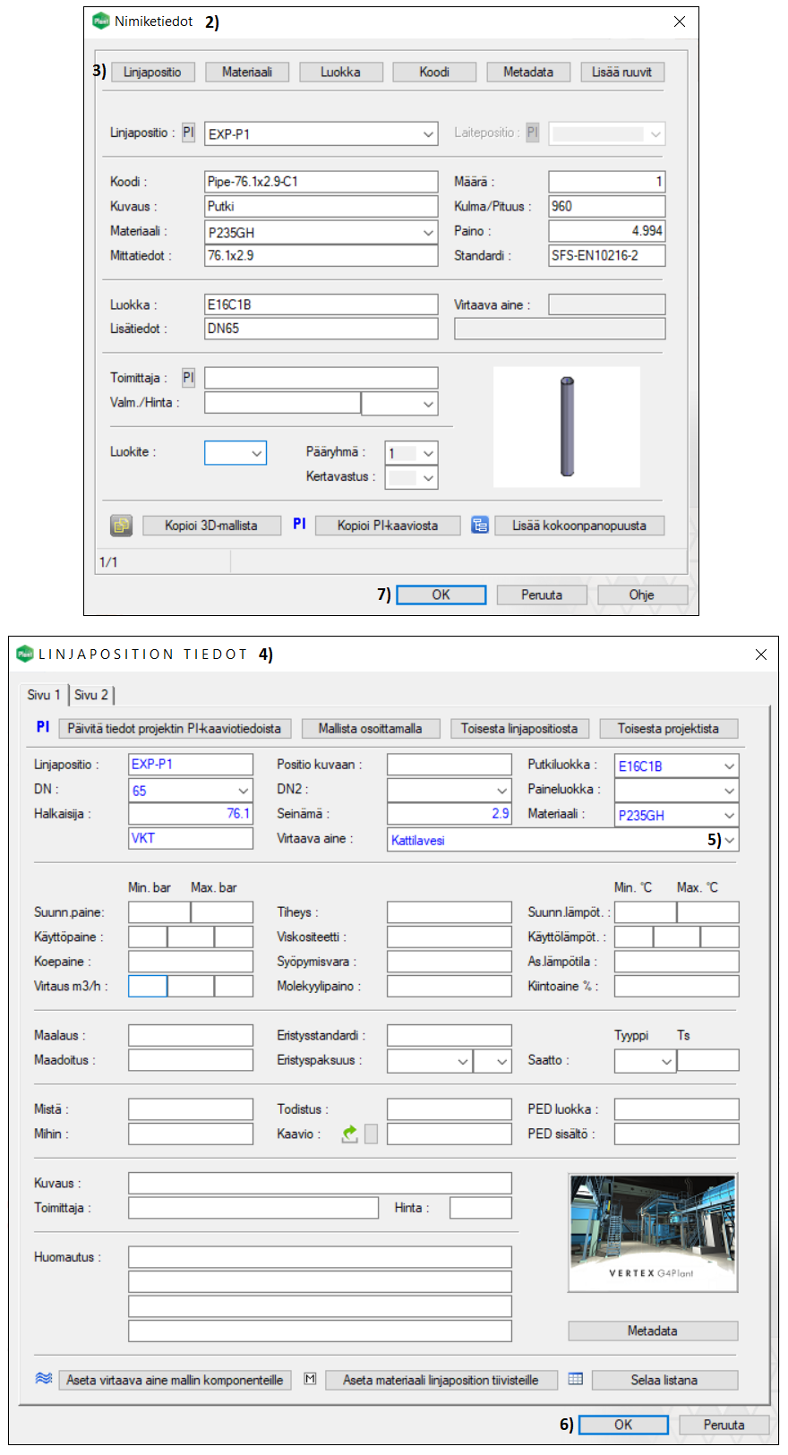 Seuraavaksi aukeaa ikkuna Linjaposition tiedot, johon ohjelma täyttää automaattisesti joitain putkilinjan perustietoja, kuvassa 4).