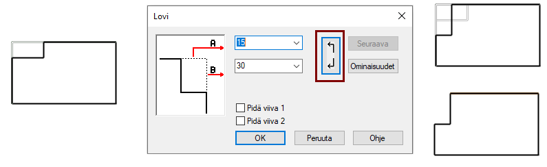 Kun olet antanut loven arvot ja lovi näyttäisi syntyvät "väärin päin", voit painaa kuvassa näkyvää painiketta, joka vaihtaa loven suuntaa.