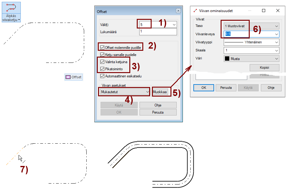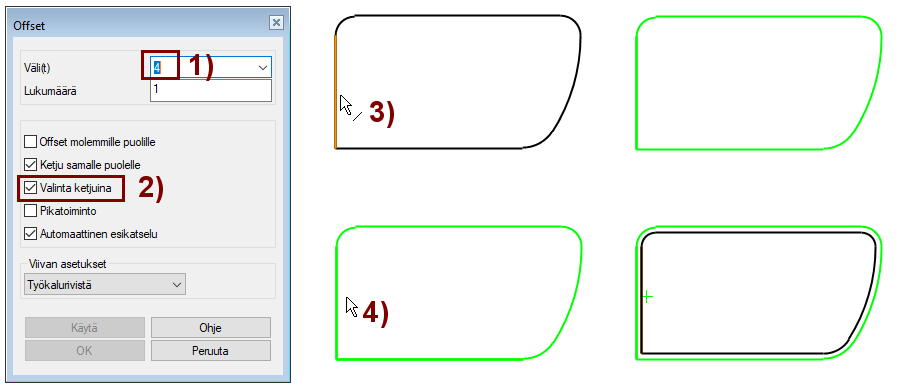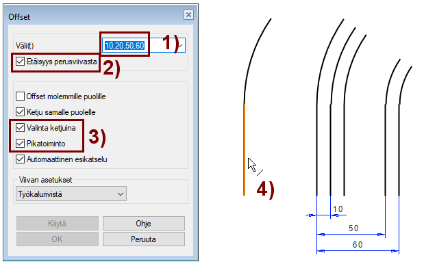 Jos Offset-dialogissa on valittuna optio Pikatoiminto, niin viivan puolta (4) ei tarvitse osoittaa.