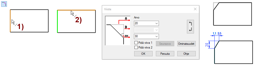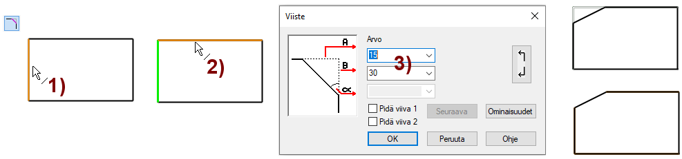 Syöttämäsi viisteiden pituus lasketaan viivan suuntaisesti viivojen risteyksestä.